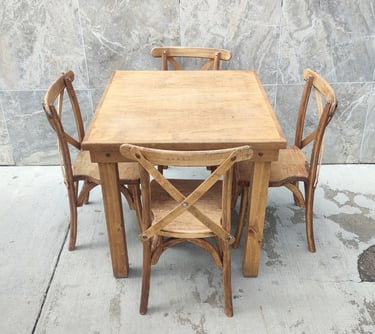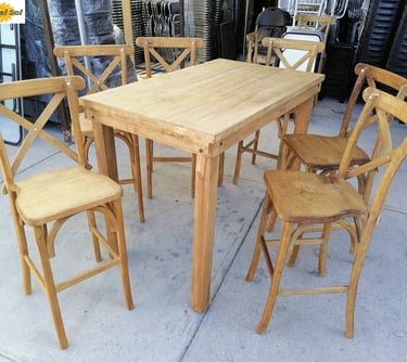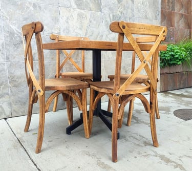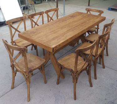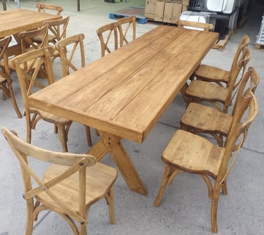 La protagonista de nuestra colección es la icónica Silla Crossback, una pieza que combina una silueta curva y femenina con la comodidad ergonómica y una construcción sólida. La acompañamos con mesas y tablones de madera con acabados vintage, diseñados para lucir su veta natural sin necesidad de manteles.