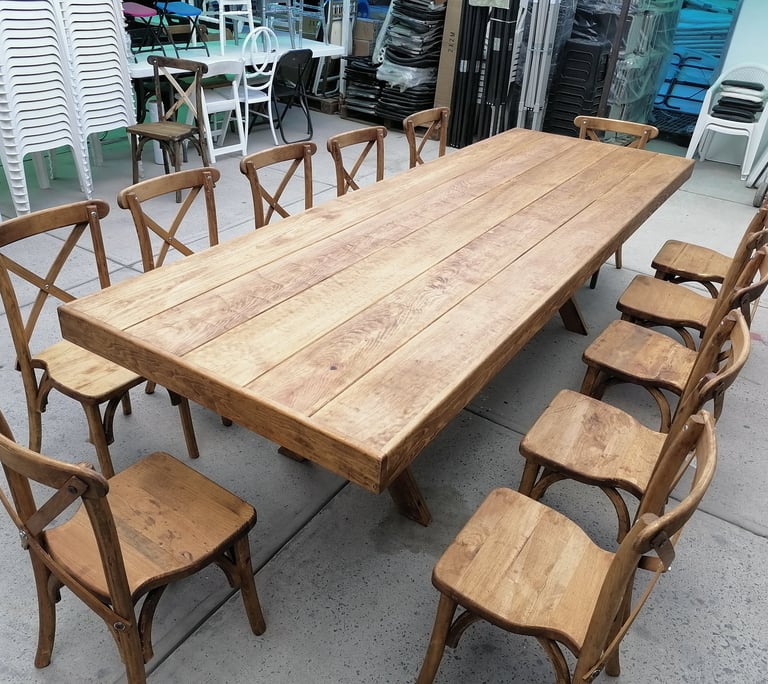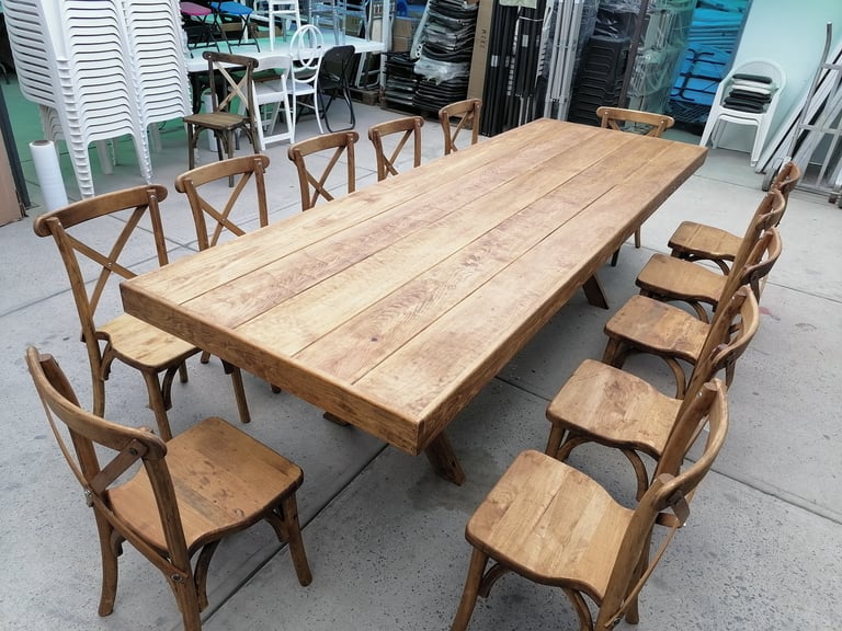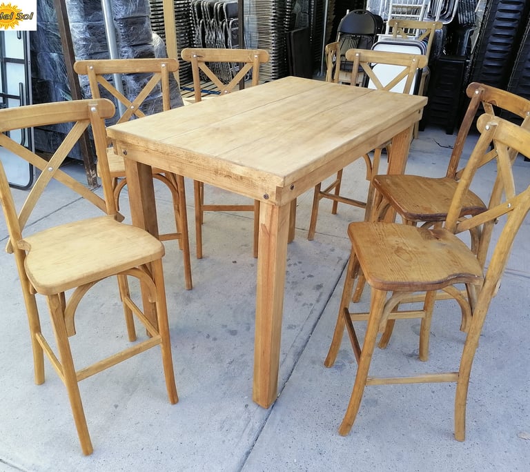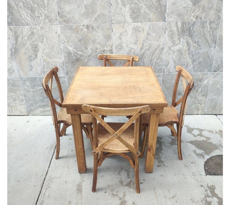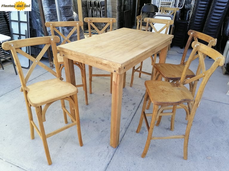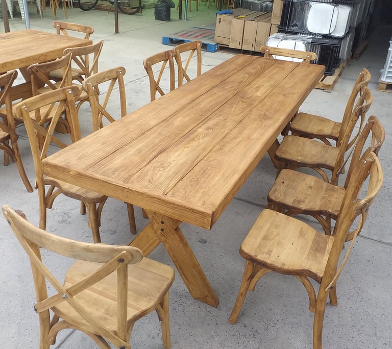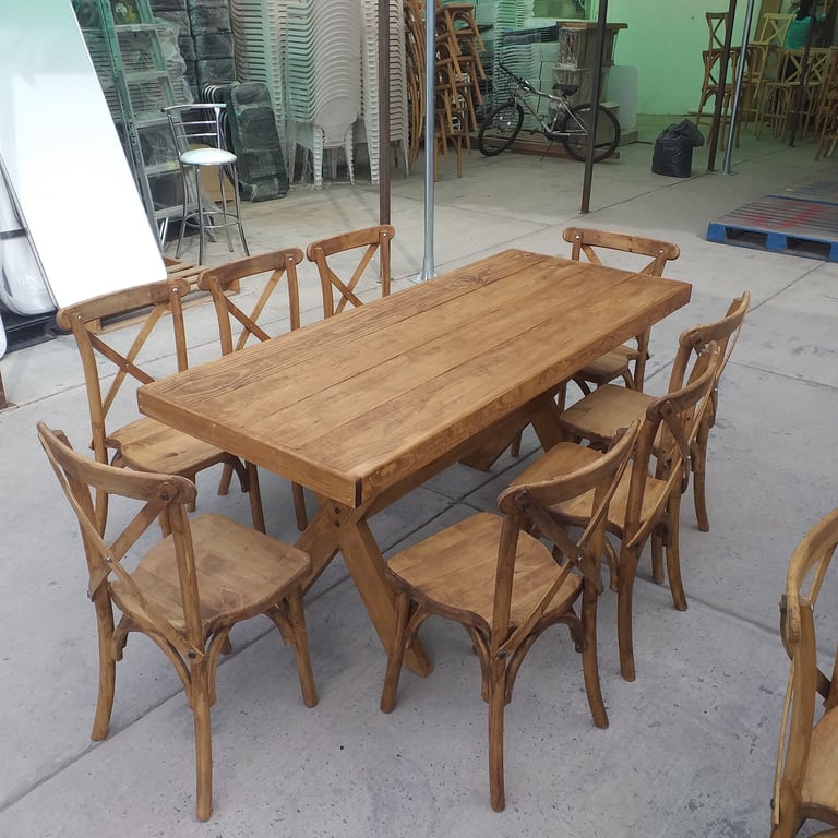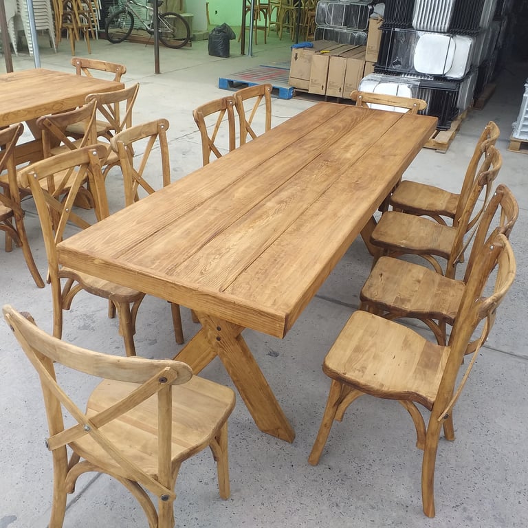 La protagonista de nuestra colección es la icónica Silla Crossback, una pieza que combina una silueta curva y femenina con la comodidad ergonómica y una construcción sólida. La acompañamos con mesas y tablones de madera con acabados vintage, diseñados para lucir su veta natural sin necesidad de manteles.