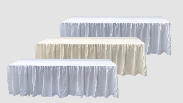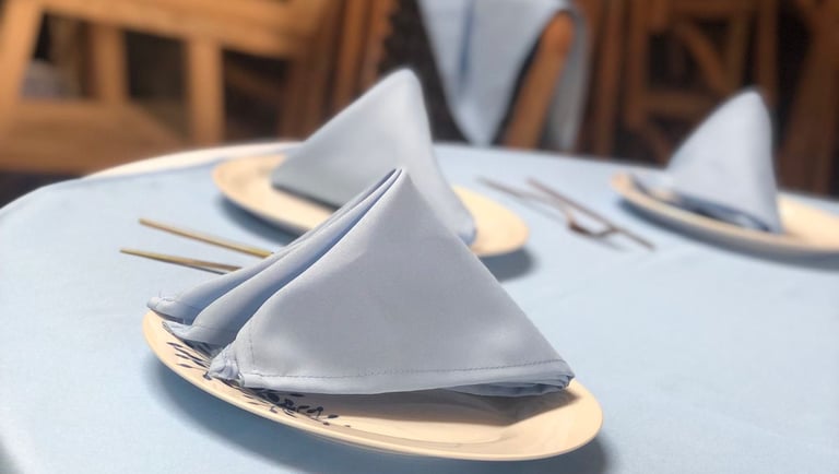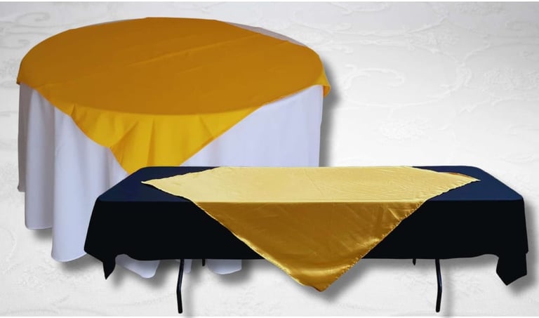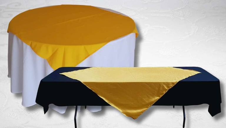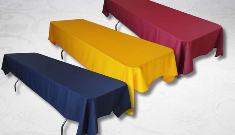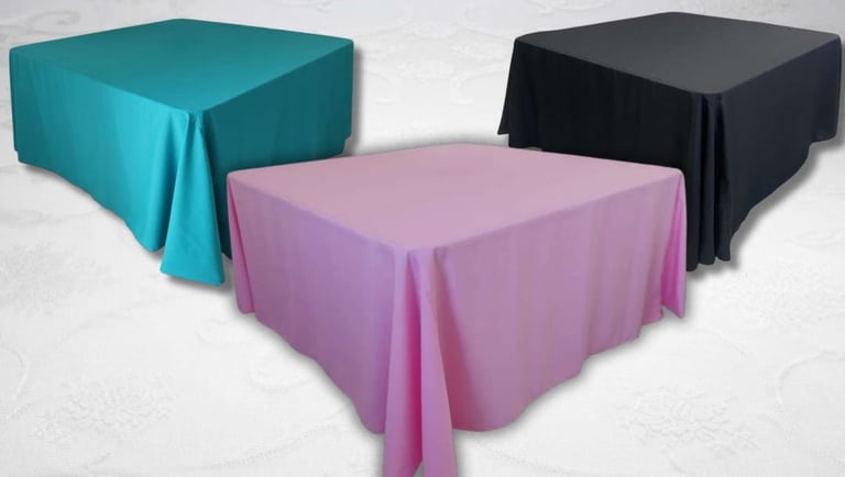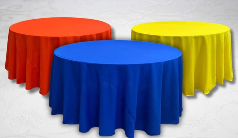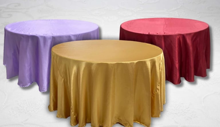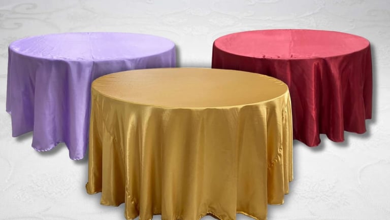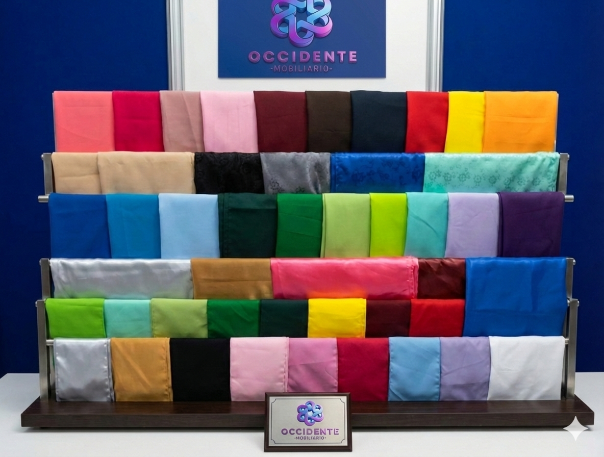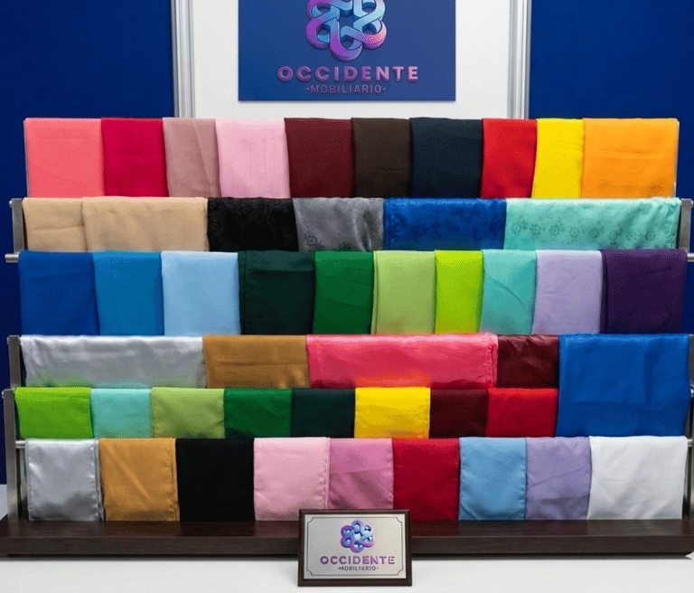 Nuestra variedad de telas y colores es incomparable. Tal como ilustra nuestro exhibidor de muestras, disponemos de un arcoíris de opciones: desde tonos vibrantes como el fucsia, verde limón y turquesa para fiestas llenas de energía, hasta colores sobrios y elegantes como el azul marino, vino, oro y plata para galas sofisticadas. Explora texturas lisas, acabados satinados brillantes o sutiles patrones para encontrar la combinación perfecta de manteles, caminos de mesa, cubre manteles y servilletas.
